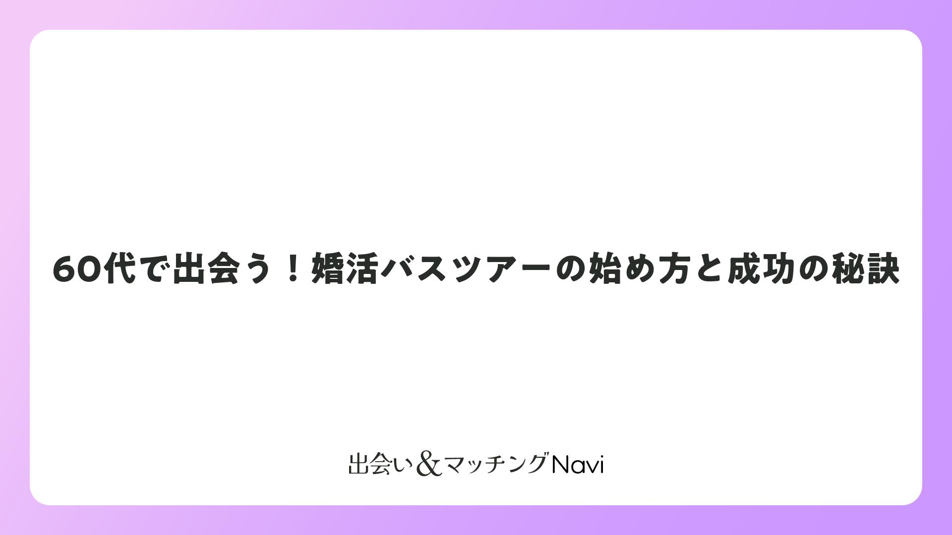60代の婚活バスツアーは、同世代の男女が一緒に観光や食事を楽しみながら交流するイベントで、自然な出会いの場を提供します。参加者は気軽に会話を楽しみ、共通の趣味や価値観を共有しやすい環境が整っています。旅行気分で参加できるため、婚活のハードルが低く、人生の新たなパートナー探しに最適な方法として多くのシニア世代に支持されています。