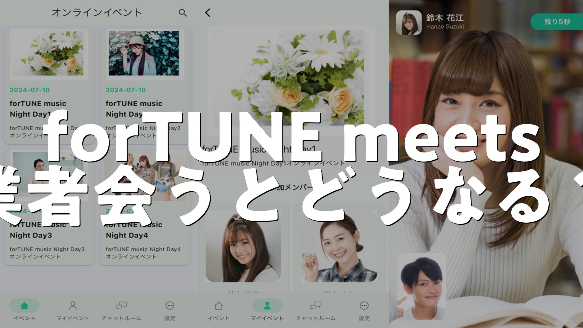 forTUNE meetsはアイドルやタレントとオンラインで1対1のトーク(ミート&グリート)を楽しめる公式アプリです。チケットを購入して当選すると決められた時間にアプリ内で本人確認を行い、カメラ越しに短時間会話ができます。遠方でも“推し”と顔を見ながら話せるのが魅力で、イベントや振替対応など運営が関わる仕組みも整っています。