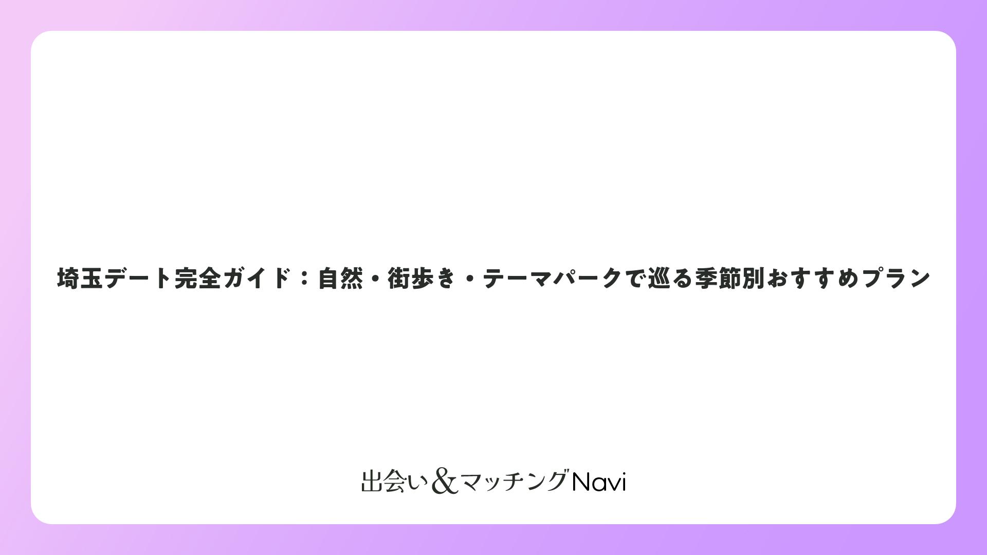 埼玉県は自然豊かな公園や歴史ある街並み、テーマパークや動物園など多彩なデートスポットが揃い、季節ごとに異なる魅力を楽しめます。川越の街歩きや秩父の自然散策、西武園ゆうえんちのレトロな雰囲気など、カップルで過ごす時間を特別なものにしてくれる場所が豊富です。アクセスも良く、日帰りデートに最適な埼玉で、思い出に残る素敵な時間を過ごしてください。