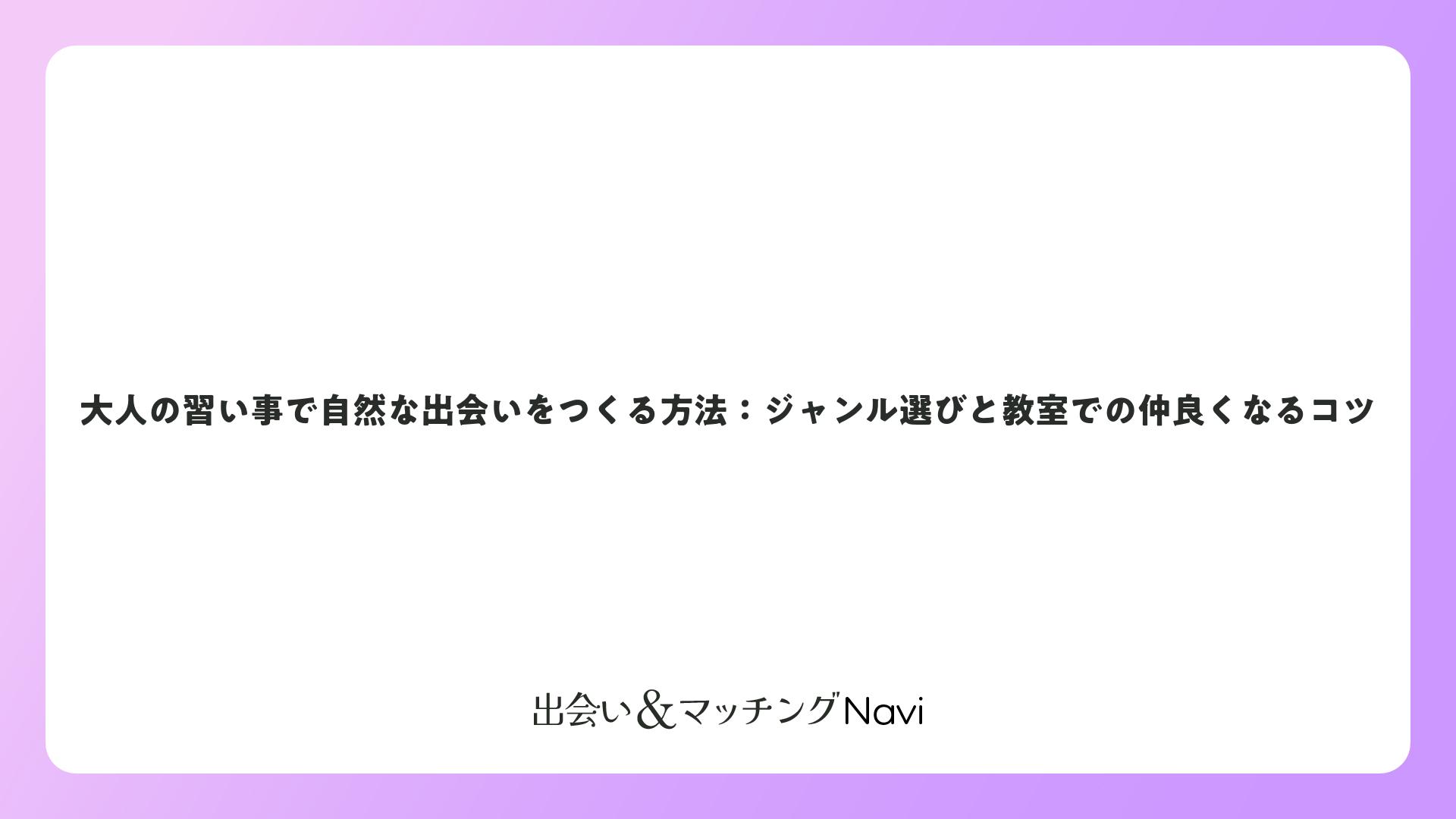 大人の習い事は、共通の趣味や目的を持つ人たちが定期的に集まることで、自然に会話が生まれ、相手の人柄や価値観が見えやすくなる場です。語学や料理、ダンス、スポーツ、ものづくり、音楽といったジャンルは、それぞれ異なる強み(会話量の多さ、共同作業、価値観の共有など)を持っており、自分の性格やライフスタイルに合った教室を選ぶことが重要です。教室選びでは男女比・年齢層・参加頻度・雰囲気・運営方針をチェックし、初対面での挨拶やペアワークでの積極性、教室外の交流を通じて無理なく関係を深めていきましょう。安全やマナーに配慮しながら、まずは自分が学び楽しめることを優先すると、結果的に良い出会いにつながります。