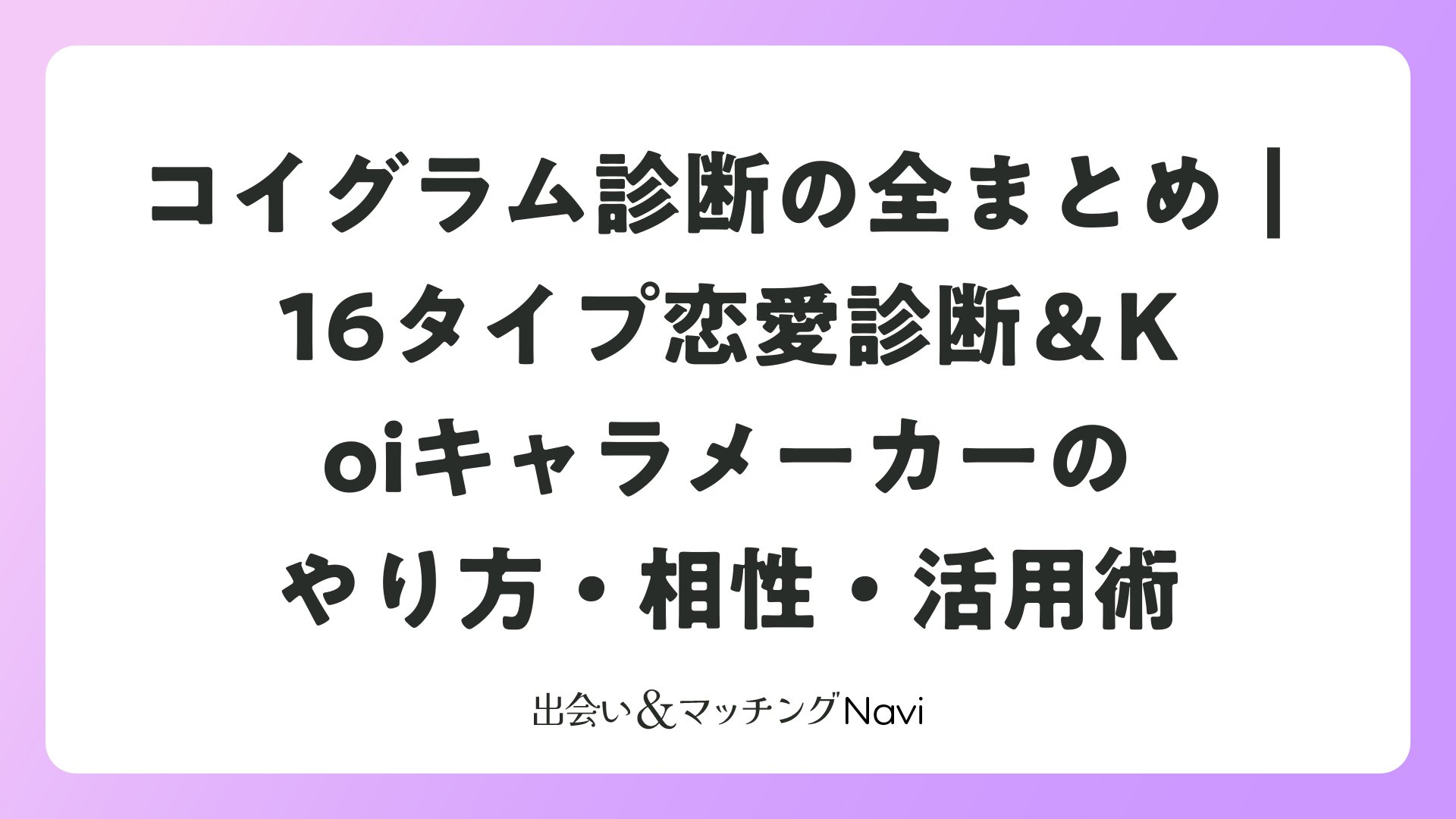 コイグラム(Koigram)には、「16タイプ恋愛診断」と「Koiキャラメーカー」の2つの診断機能があります。16タイプ恋愛診断は心理学者・富田隆氏監修の本格的な性格分類で、全50問に回答することで自分の恋愛傾向が16タイプのいずれかに分類されます。Koiキャラメーカーは2025年12月に追加された新機能で、AIとの対話から自分だけのオリジナルキャラクターが生成される診断です。この記事では、全タイプの特徴や相性、診断のやり方、マッチング率を上げる活用法まで網羅的に解説します。