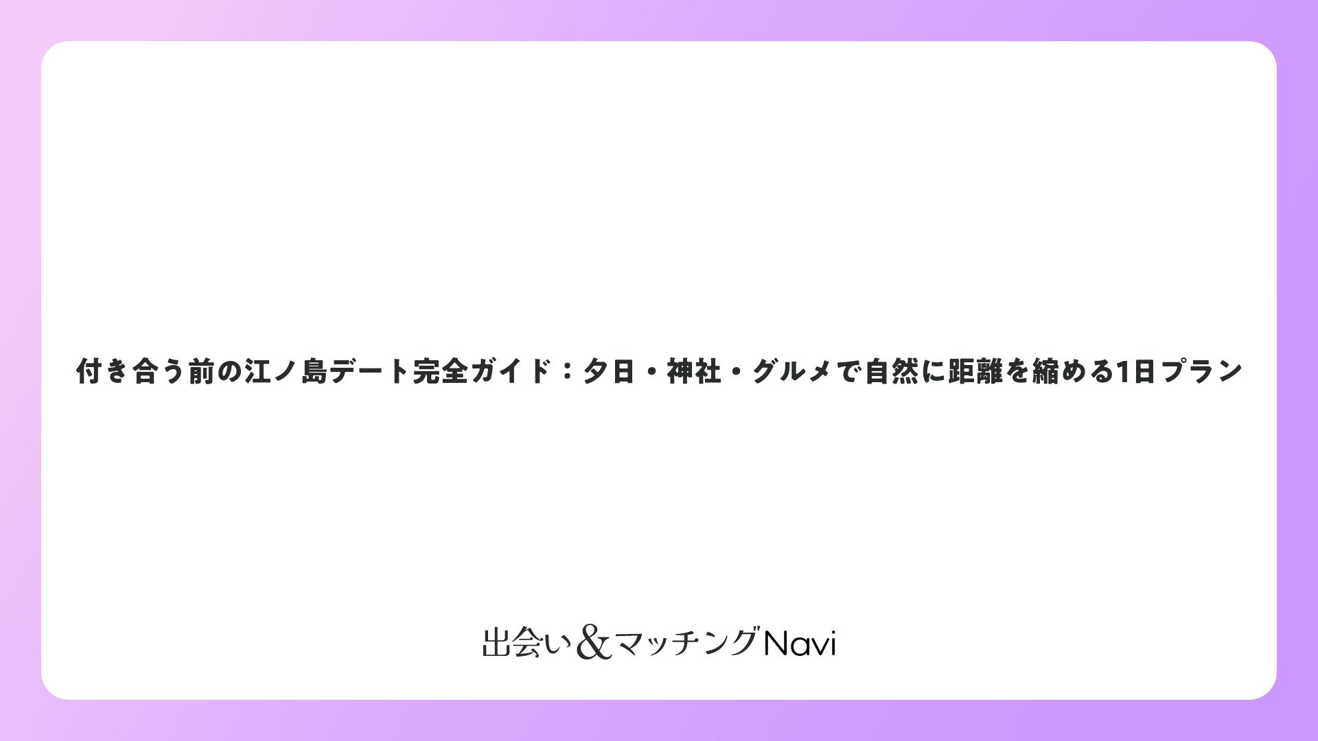美しい海、神社、グルメを満喫し、夕日で締めくくる江ノ島デート付き合う前は、関係を進展させる最高の機会。今日の記事を参考に、自信を持ってデートを楽しんでください。きっと良い方向へ進みますよ!