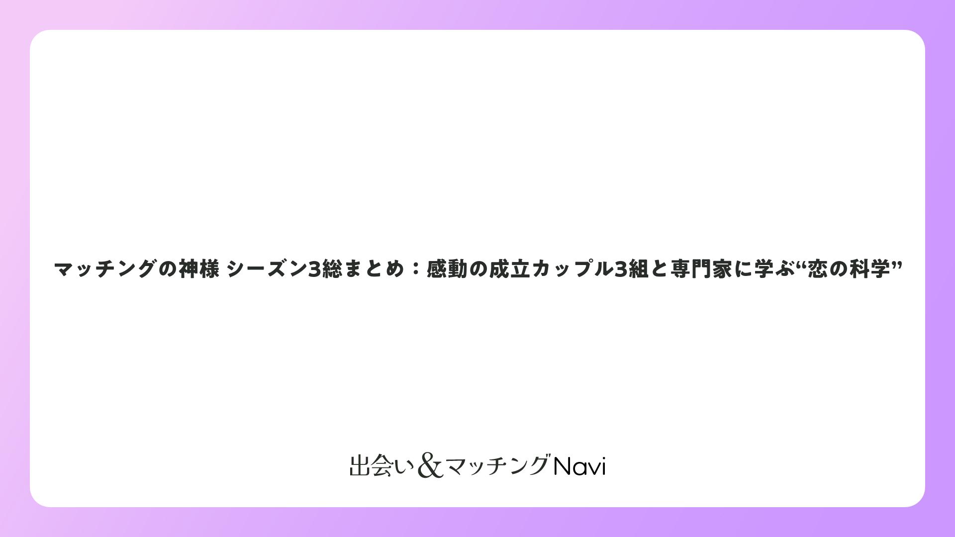 マッチングの神様シーズン3は、科学的なマッチングとリアルな恋愛成長を描いた傑作。成立カップルの幸せなその後や専門家の知見が、視聴者に希望と実践的な学びを提供します。恋愛に悩むすべての人に自信を持っておすすめできる番組です。