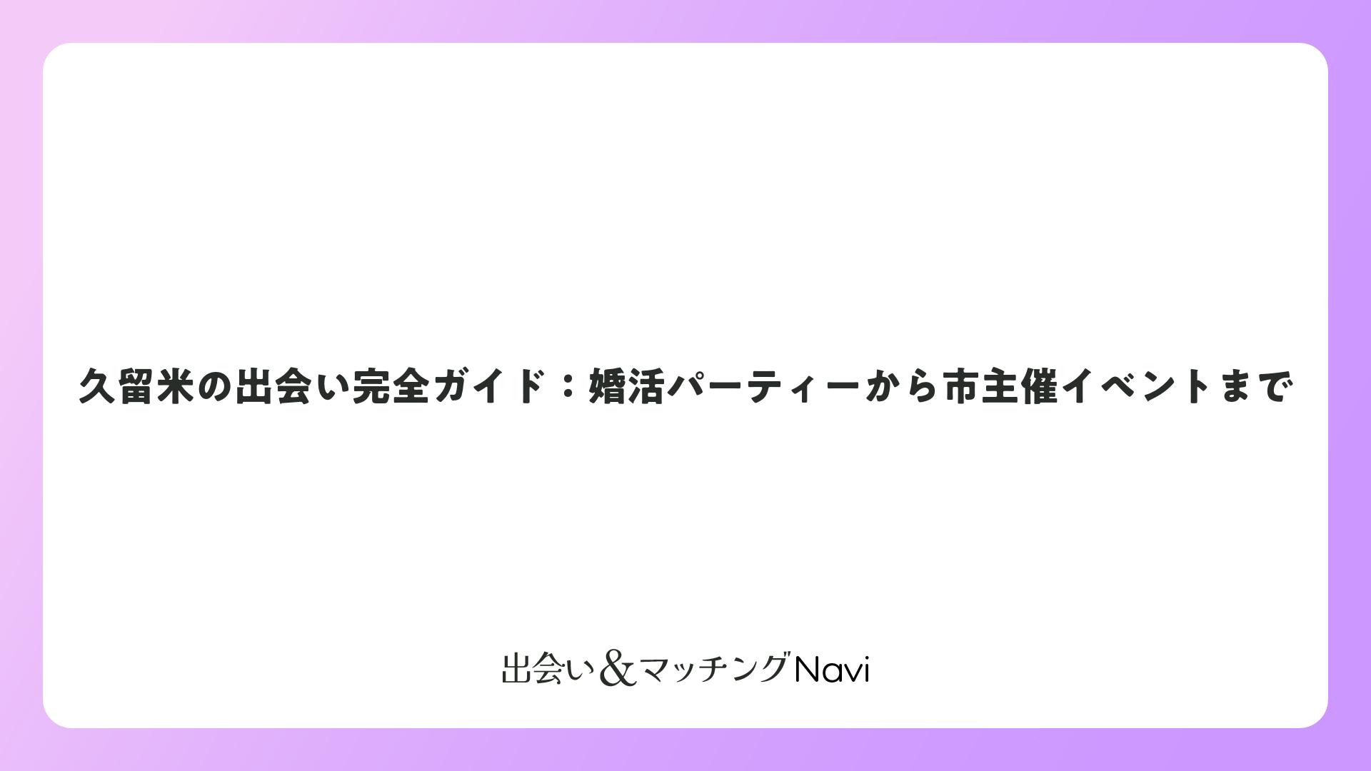久留米市は、充実した出会いの場が数多く存在する地域です。婚活パーティーから自治体主催のイベント、街コンまで、様々なスタイルの出会いの機会が提供されており、参加者のニーズに応じて選択することができます。アクセスの良い会場、多様なイベント形式、真剣な参加者が集まる環境が整っているため、理想のパートナーを見つける可能性が高いです。複数のイベントに参加し、自分に合ったイベント形式を選ぶことで、出会いの成功率を高めることができます。女性の参加費が無料または低額に設定されているイベントが多いため、気軽に参加しやすい環境が実現しています。積極的にイベントに参加し、素敵なパートナーを見つけることで、新しい人生の第一歩を踏み出しましょう。