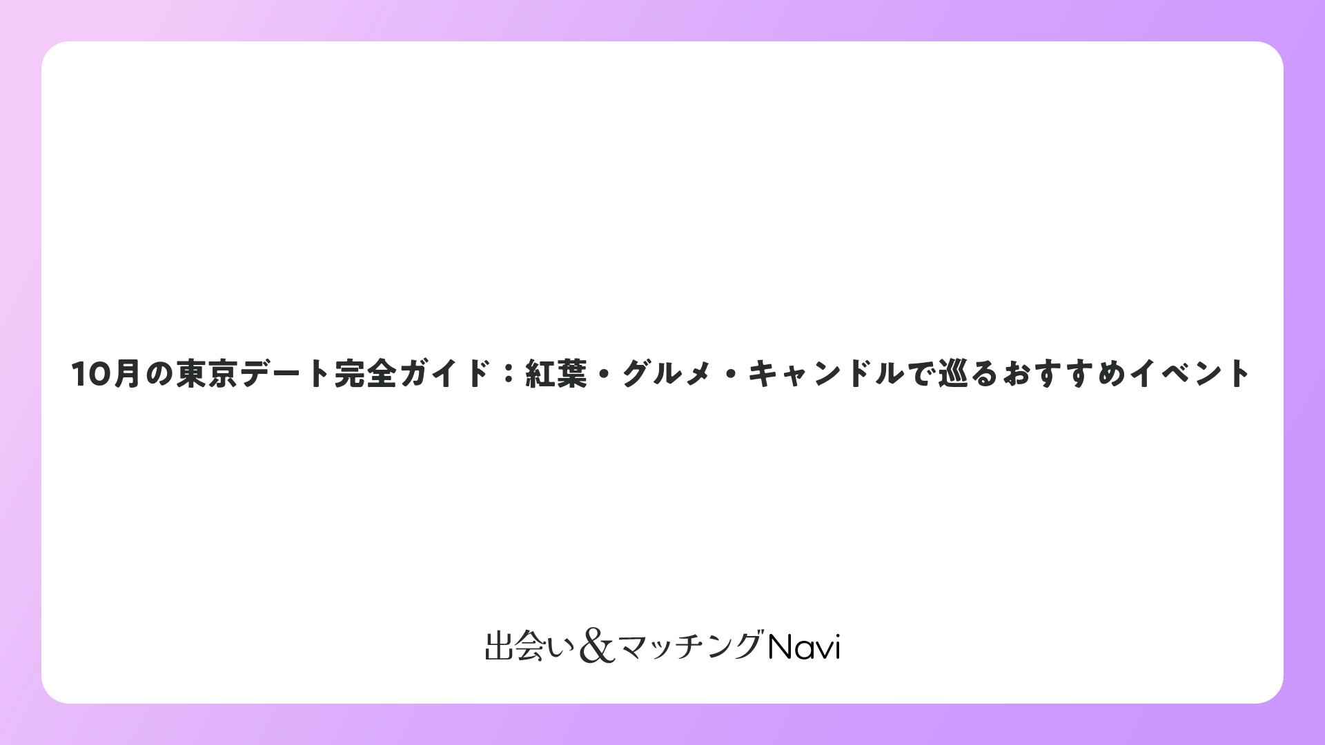 ODAIBA おいもフェス、高尾山もみじまつり、TOKYO TOWER CANDLE DAYSをはじめ、九州フェアやEBISU JAMなど、食と芸術と音楽が融合したイベントが満載。アクセス良好で季節感あふれるスポットを選べば、会話も弾み、思い出深いデートが実現します。10月の東京で、愛を深める素敵な時間を過ごしましょう。