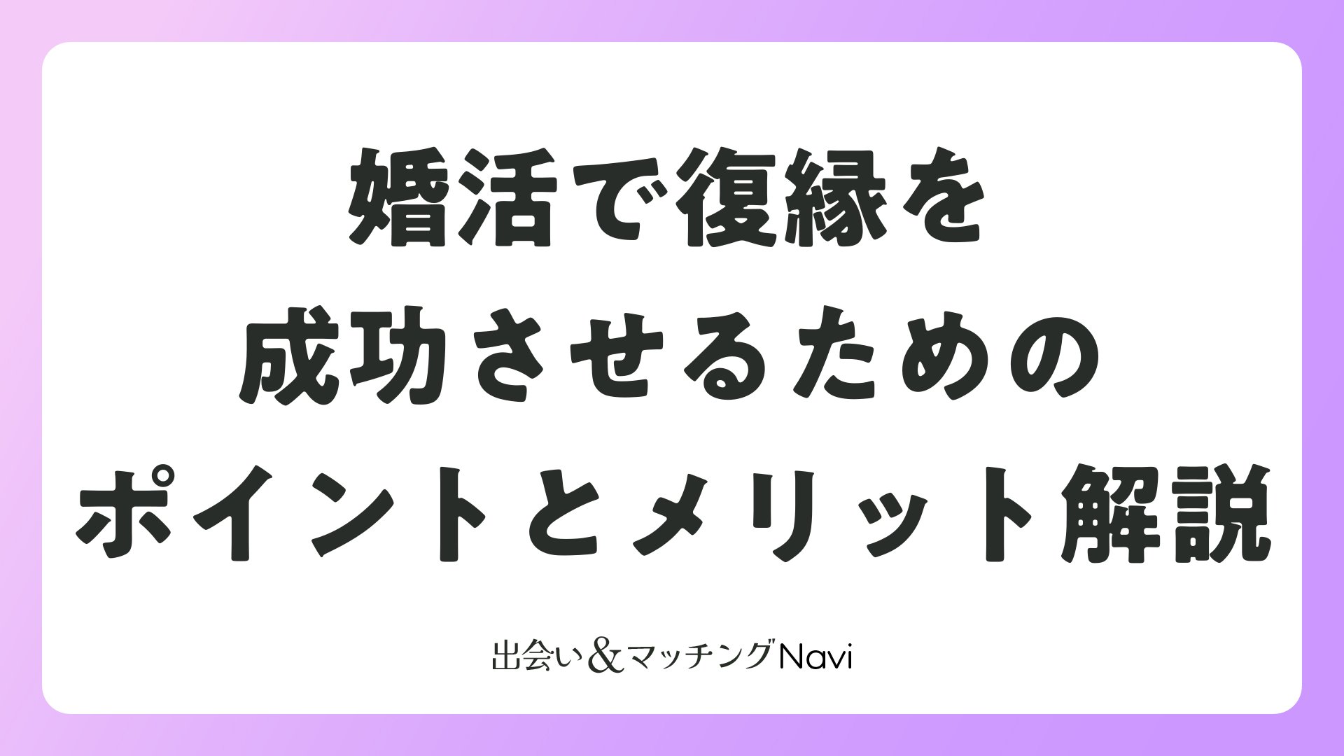 婚活を進める中で、過去の相手との復縁を考える人は少なくありません。マッチングアプリや結婚相談所で出会った人とのやり直しは、タイミングや心構え次第で新たな幸せにつながる可能性を秘めています。この記事では、婚活メディアの読者向けに、復縁のメリットを活かし、成功率を高める実践的な方法を紹介します。