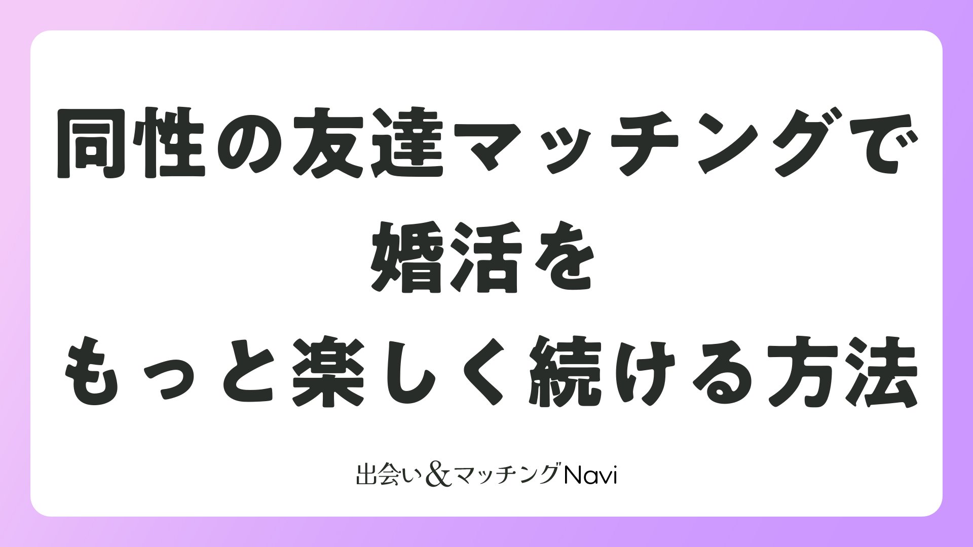 マッチングアプリは恋愛や婚活の場として人気ですが、同性の友達マッチングも大きな魅力です。婚活中に同じ悩みを抱える同性とつながることで、情報交換や励まし合いができ、活動がよりスムーズに進みます。この記事では、読者の皆さんが安心して同性友達を見つけ、婚活をポジティブに楽しむためのポイントを詳しく解説します。