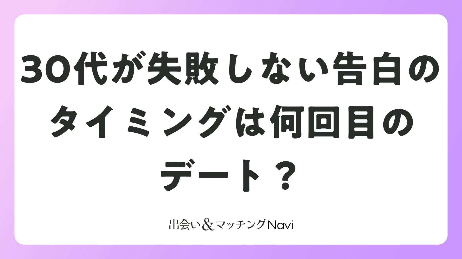 30代のマッチングアプリや婚活で出会った相手とのデートでは、告白のタイミングが関係の進展を左右します。多くの調査で3回目のデートが最適とされ、早すぎず遅すぎずお互いの相性を確かめられる時期です。この記事では、30代向けにデート回数別のポイントや成功のコツを詳しくお伝えします。