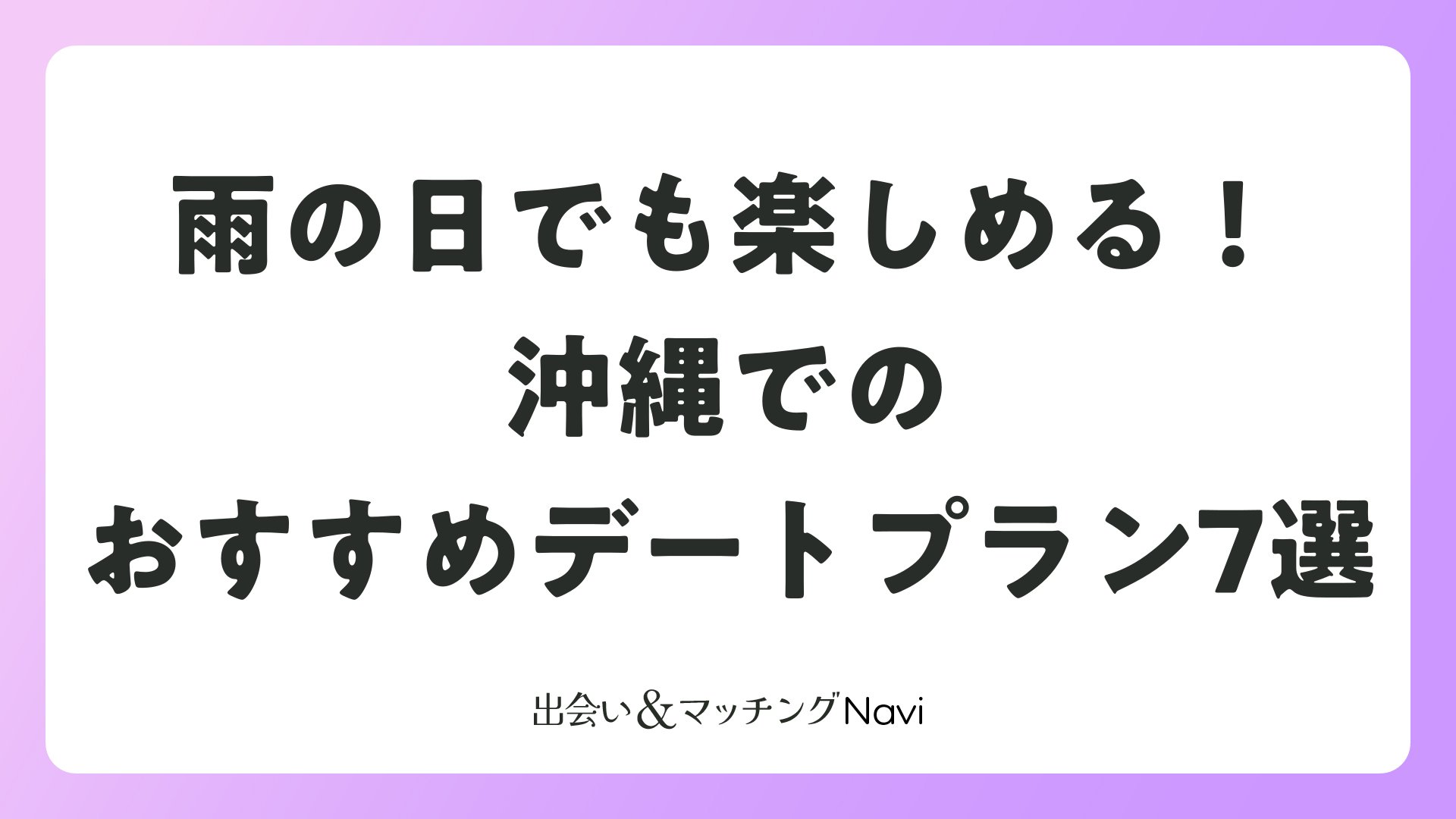 沖縄での雨の日デートは、マッチングアプリで出会った相手との関係を深める絶好の機会です。屋内施設が充実した沖縄だからこそ、雨の日でも快適で楽しいデートを実現させることができます。事前の計画、相手への配慮、ポジティブな態度を心がけることで、雨の日デートを特別な思い出に変えることができるでしょう。マッチングアプリで素敵な相手と出会えたなら、天気に関わらず、その出会いを大切にしてください。