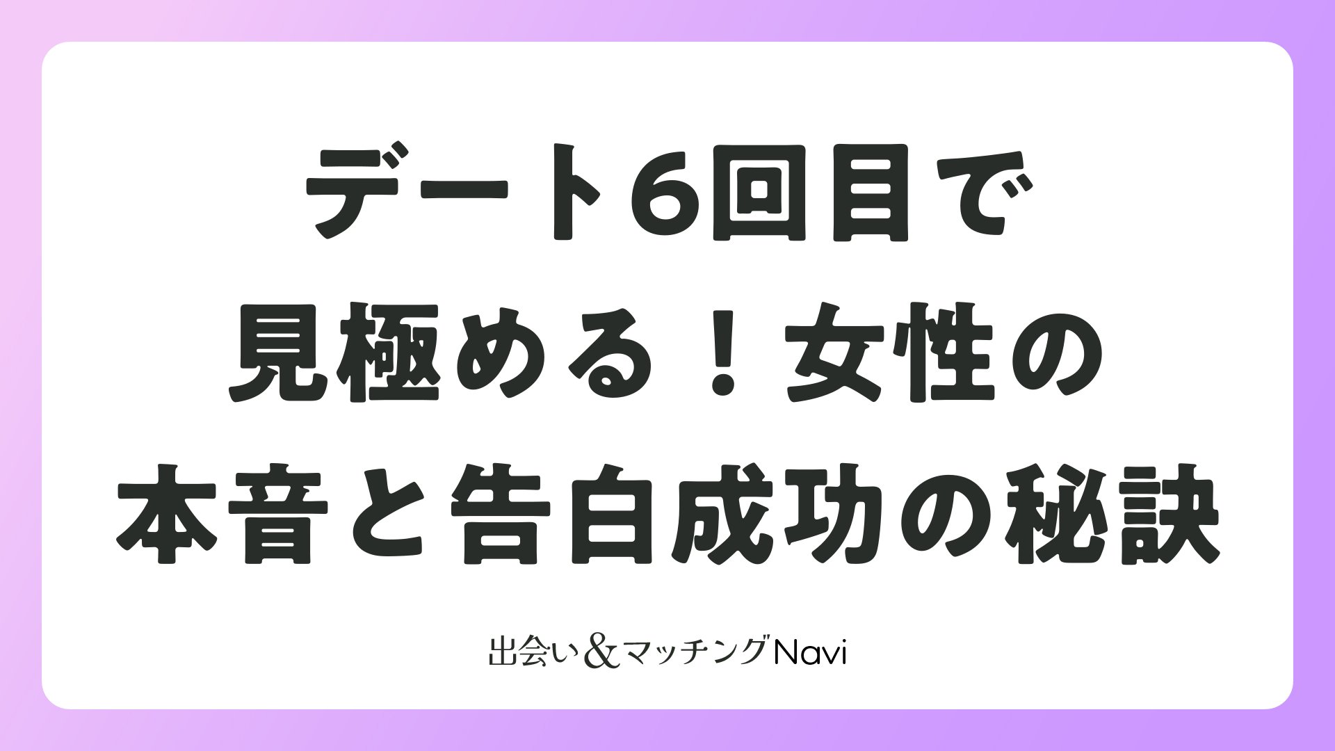 マッチングアプリで出会った相手とデート6回目を迎えるということは、すでに大きな信頼関係が築かれている証拠です。このタイミングは、関係を次のステージへ進める絶好のチャンス。女性心理を理解し、適切な行動を取ることで、付き合う方向へスムーズに導けます。この記事では、デート6回目の重要性、女性の気持ち、会話術、デートプラン、告白のコツを詳しく解説します。
