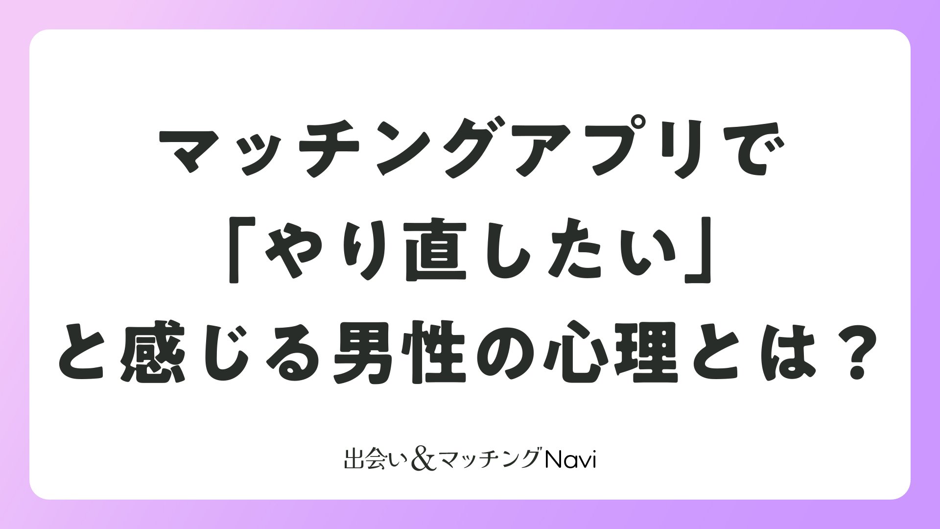 マッチングアプリで出会った恋がうまくいかず、「やり直したい」と感じる男性は少なくありません。この記事では、そんなやり直したい男性心理を紐解き、婚活や恋活を続けるためのポジティブなアプローチを紹介します。過去の失敗を活かし、次こそ本気の関係を築くヒントをお届けします。