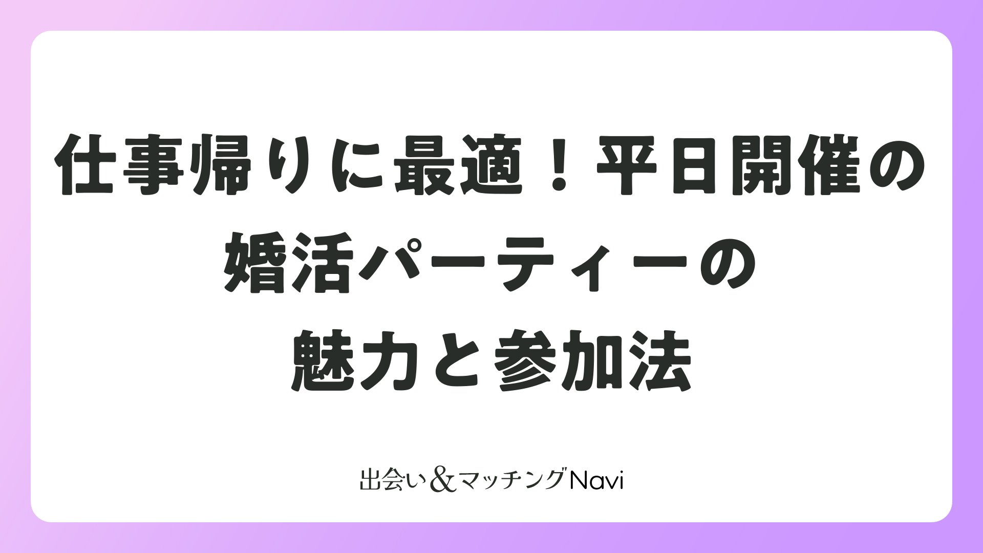 婚活パーティーの平日開催は、忙しい社会人にとって最適な出会いの場です。仕事後の時間帯を中心に、気軽に参加できるイベントが多く、土日よりお得な料金設定が魅力です。この記事では、婚活パーティー平日のメリット、選び方、参加のコツを詳しく解説し、読者の皆さんが理想のパートナーと出会えるようサポートします。
