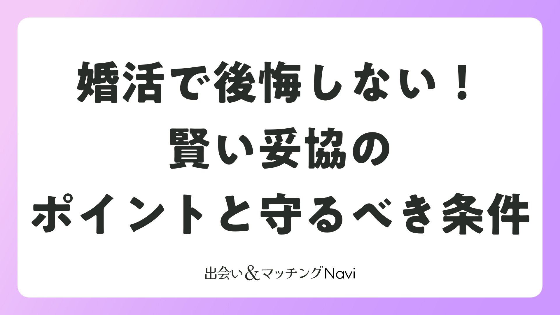 婚活では理想の相手を求める中で、妥協のバランスが成功のカギとなります。この記事では、マッチングアプリや婚活パーティー、結婚相談所を利用する皆さんに、後悔しない婚活のための妥協すべきポイント絶対に守るべき条件を、経験者や専門家の知見を基に詳しく解説します。現実的な視点を取り入れつつ、心から納得できるパートナー選びをサポートします。
