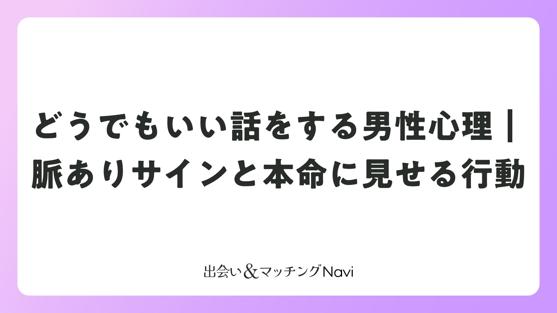 気になる男性から「今ランチ食べてる」「駅で猫見つけた」など、一見なんでもない話題のLINEやメッセージが届くことはありませんか。こうした一見どうでもいい話の裏には、実は男性ならではの心理が隠れていることが少なくありません。マッチングアプリで知り合った相手や、気になっている人から他愛もない話題ばかり送られてくると「これって脈ありなの?」「私のこと、どう思っているの?」と気になってしまうもの。この記事では、男性がどうでもいい話をする心理を紐解きながら、本命女性にだけ見せるサインや脈ありの見極め方、そして返信のコツまで丁寧に解説していきます。恋愛や婚活をスムーズに進めたい女性にとって、男性心理を知ることは最短ルートへの近道です。